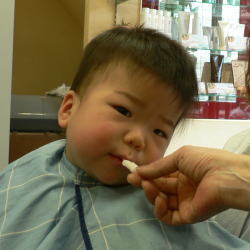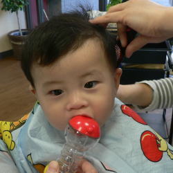 | お気に入りのおしやぶりはカット中も欠かせません(^―^) |