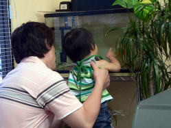▲お父さんのひざの上で、腹ばいになっています!