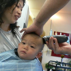 | バリカンの「ブ〜ン」の音にも怖がらず、とてもおりこうさんでした! |