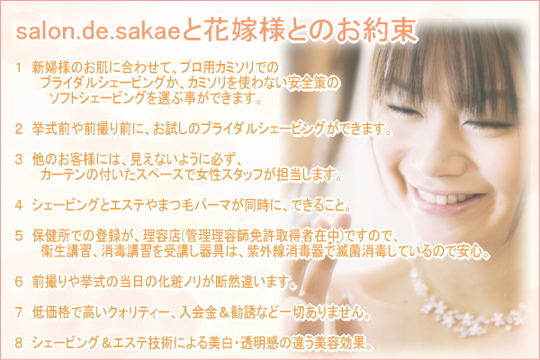 | Q、当日、何日前にブライダルシェービングをしたら良いですか? A、一番肌が、落ち着いた状態が、ブライダルシェービングして2日ほど、経過した状態ですので、当店では、本番2日前のブライダルシェービングをオススメいたしております。 |