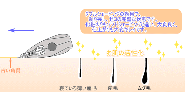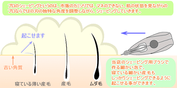 | Q、お家で市販のカミソリで剃るのと、お店で剃っていただくのは、どう違うのですか? A、一般の市販されているカミソリと比べると、切れ味がちがいます!当店では、必ず女性スタッフ(理容師免許習得者)がプロ用の剃刀で丁寧なお顔剃りをさせていただきますので安心してお越し下さい。 |